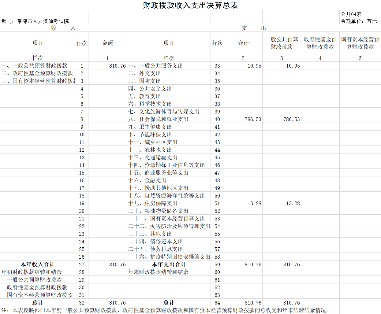 2024年度财政拨款收、支总计810.76万元,与上年相比,减少95.5万元,下降10.54%,主要原因是:一是受人员变动和工资政策变动影响,人员减少,人员经费减少;二是执业资格考试报名人数下降,组考数量减少,相应收支下降。