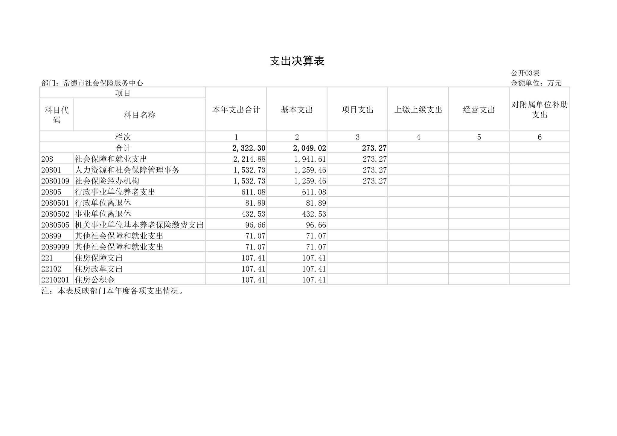 2024年度支出合计2322.30万元,其中:基本支出2049.03万元,占88.23%;项目支出273.27万元,占11.77%;上缴上级支出0万元,占0%;经营支出0万元,占0%;对附属单位补助支出0万元,占0%。